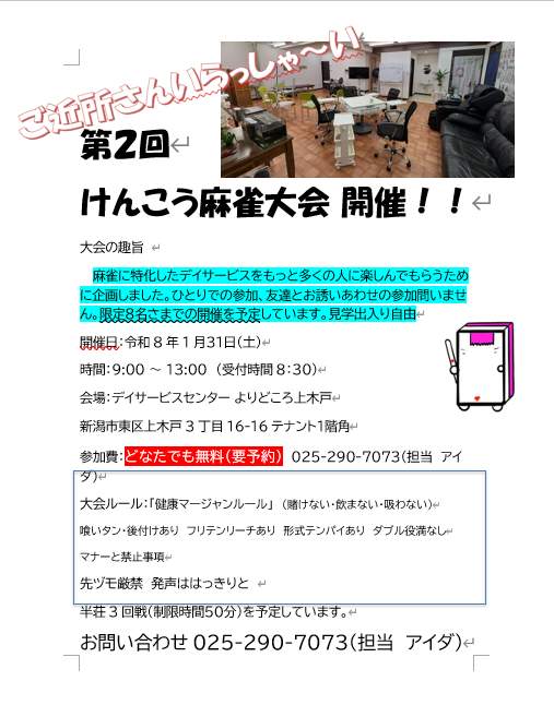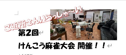 (告知)第2回 地域交流麻雀大会 未分類 2025.12.132026.01.16 第一回はRMUの「なみすんプロ」が参戦していただき、 大変盛り上がることができました。 懲りずに第2回目も開催を予定しています。 どしどしご応募おまちしています。